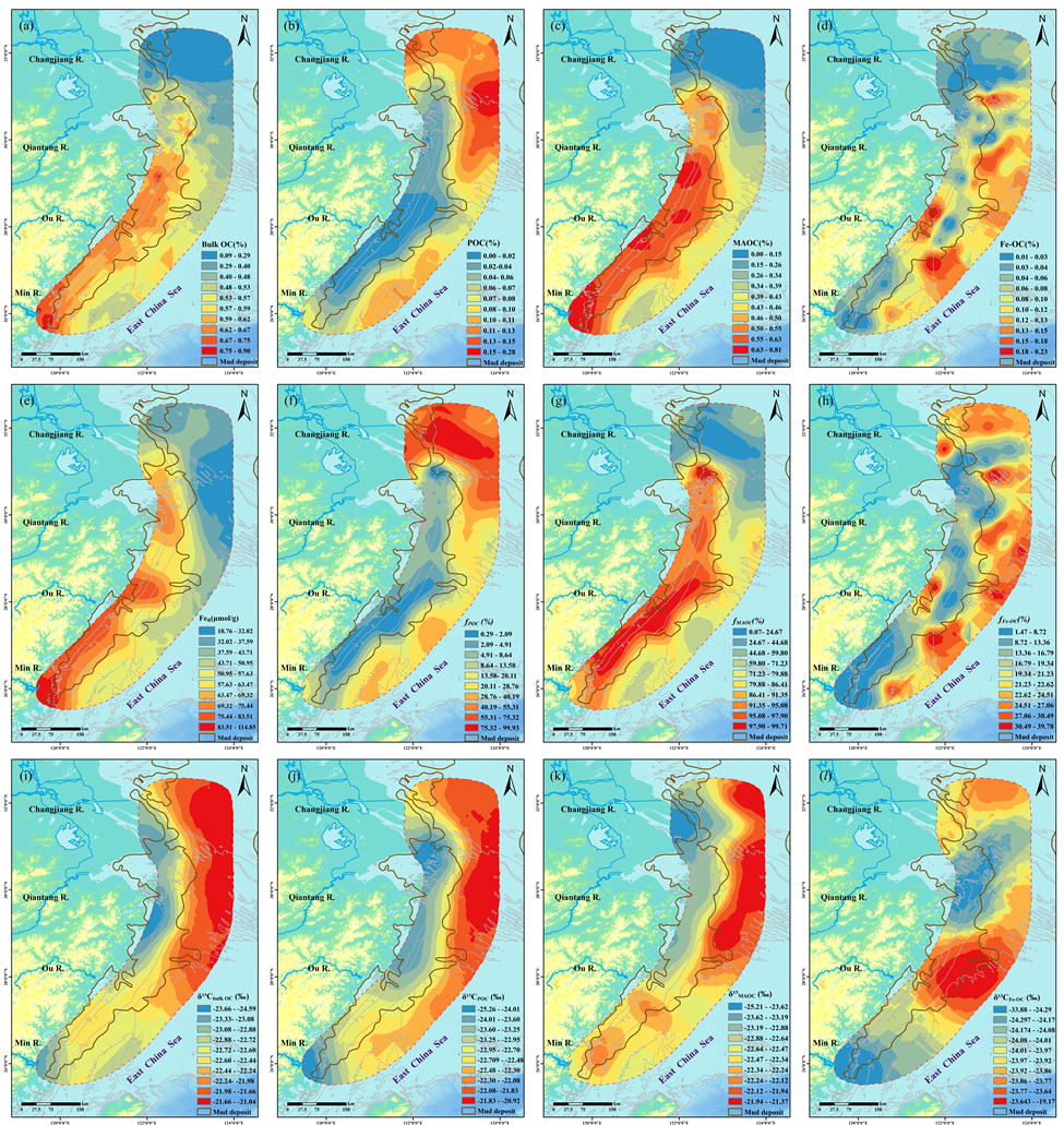 图-2 长江河口-东海内陆架区表层沉积物中不同形态OC的空间分布格局; (a) TOC含量;(b) 颗粒态OC含量;(c) 矿物结合态OC含量;(d) 铁结合态OC含量;(e)活性铁含量;(f) 颗粒态OC占比;(g) 矿物结合态OC占比;(h) 铁结合态OC占比;(i) δ13CTOC值;(j) δ13CPOC值;(i) δ13CMAOC值;(j) δ13CFe-OC值。