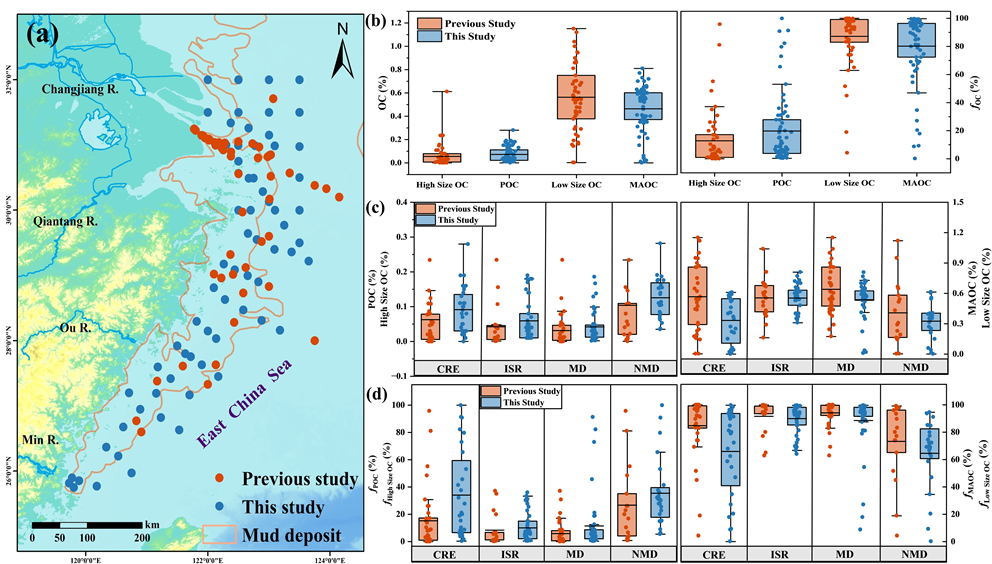 图-3 沉积环境转变影响下POC和MAOC的时空格局变化; (a)前人研究和本次研究数据的采样点对比图; (b)前人研究和本次研究中各种OC形态的比较; (c)前人研究和本次研究中长江口-东海内陆架不同区域POC与MAOC含量的比较; (d) 前人研究和本次研究中长江口-东海内陆架不同区域POC与MAOC占比的比较。