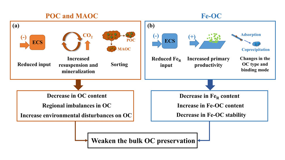 受大河影响的陆架边缘海通常具有高陆源输入、高初级生产力、高沉积速率和高埋藏效率等特点,是陆源有机碳(OC)的重要埋藏场所,也是研究有机碳保存及埋藏的天然试验场。近年来,随着流域人类活动的不断加剧,尤其是水库等水利工程的大量建设,使得河流入海沉积物通量显著降低。一方面,这直接导致与沉积物共存的颗粒OC的来源和入海通量显著变化;另一方面,入海泥沙减少还导致河口及邻近陆架区的沉积环境发生改变,引发底床沉积物的侵蚀粗化。在此背景下,河口-陆架区的沉积有机质来源、组成及时空格局必然发生剧烈改变。