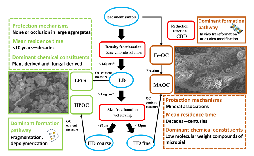 图-1 不同密度组分、不同粒径组分沉积有机碳以及铁结合有机碳的分离提取过程示意图
