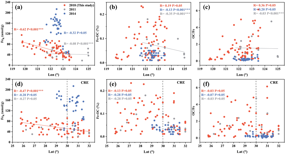 图-4 沉积环境转变影响下FeR, Fe-OC和OC/Fe的时空格局变化;(a-c)FeR、Fe-OC、OC/Fe与经度之间的关系;(d-f)FeR、Fe-OC、OC/Fe与纬度之间的关系。