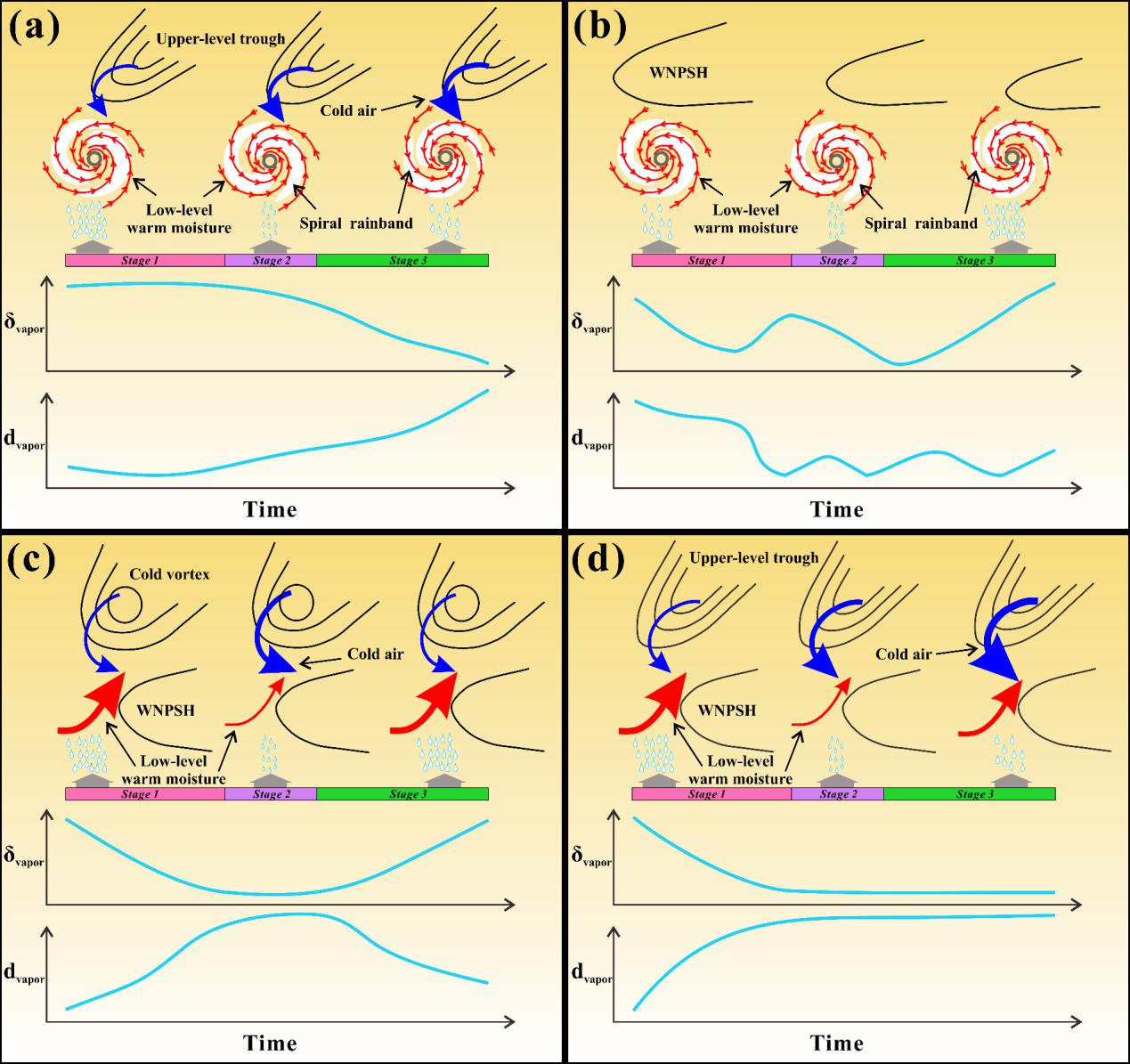 针对这一问题,庞洪喜教授课题组基于betway西汉姆联地球系统区域过程综合观测试验基地(SORPES)长时间连续高分辨率水汽稳定同位素观测资料,结合地面气象观测、卫星观测资料、再分析资料等,系统分析了东亚地区暴雨过程中水汽同位素变化特征及其揭示的暴雨形成机制。研究发现,在不同天气系统的影响下,水汽稳定同位素值呈4种变化模式,包括缓慢下降型(台风与中高纬度系统相互作用,图1a)、W型(台风本体,图1b)、U型(冷涡,图1c)和L型(高空槽,图1d)。通过分析稳定同位素演化特征(图1)、后向轨迹模拟结果(图2)及瑞利分馏模型计算结果(图3),发现中国东部的暴雨事件主要由邻近海洋(包括南海和东海)和陆地环境的水汽维持,印度洋远源水汽的贡献相对较弱。基于稳定同位素演化特征(图4)、850hPa风场和相当黑体温度(图5)的综合分析,发现暴雨过程的间歇期对应了低层天气系统强度变化或整体转换导致的近海水汽输送改变。此外,本研究首次提出,分析大气水汽同位素水线斜率的变化可为暴雨事件预报提供前兆信号(图6)。上述认识对于深入理解东亚地区暴雨事件发生机理具有重要意义,为使用水汽稳定同位素示踪东亚暴雨过程提供了基准。