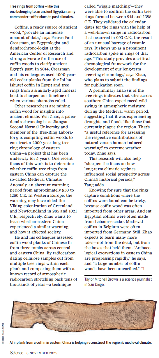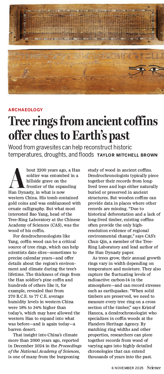 近日,公司杨保教授团队的研究成果获得国际权威学术期刊《科学》(Science)新闻版块(News)关注,并以《古代棺木年轮为洞悉地球过去提供线索》(“Tree rings from ancient coffins offer clues to Earth’s past”)为题进行专题报道。