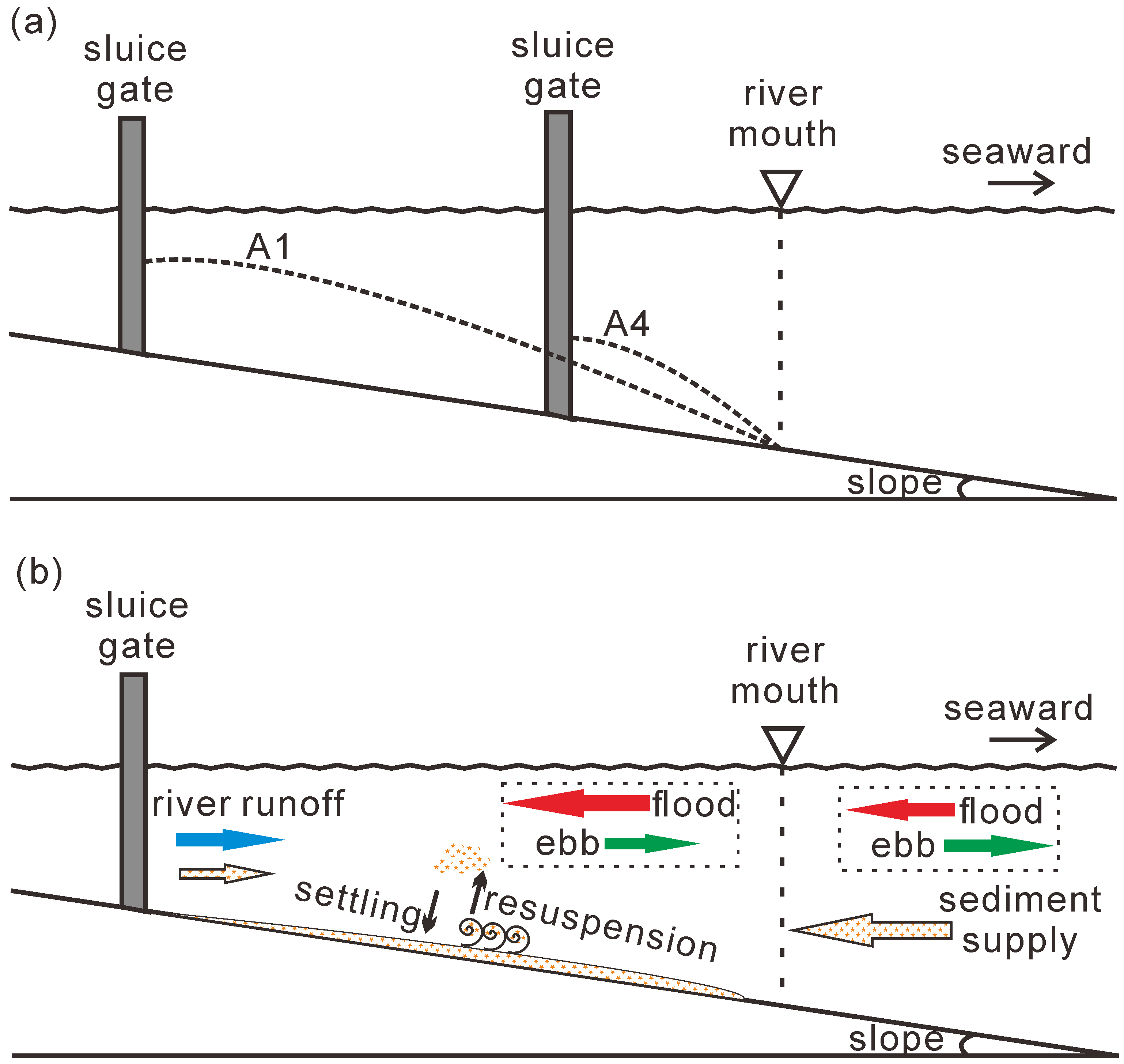 河口海岸区域经济发达,是人类生产和生活的重要场所,同时也是人类活动强烈干预的地区。为了挡潮御卤、排洪蓄淡,我国沿海地区在大部分中小河流的河口都兴建了挡潮闸,其中以苏北流域建闸最多。挡潮闸的修筑发挥了积极的经济和社会效益,但建闸改变了原有水流的水动力和地貌冲淤特性,常常导致闸下河道发生严重淤积,影响河道通航和排涝。课题组采用经过验证的Delft3D进行数值模拟,以新洋港河口为例,重现了挡潮闸控制下的河口地貌演化过程,发现挡潮闸修建后潮波发生变形,潮汐不对称性显著增强,涨潮流携沙能力增大,落潮流冲淤能力减小,进而导致沉积物在闸下河道大量淤积,产生了闸下河床高于上游河床的“人新世”沉积。通过构建不同模拟方案,该研究发现闸下河道长度、开闸放水时间节点、放水频率和时长以及机械疏浚均对闸下河道地貌演化产生重要影响。靠近河口建闸、优化河闸放水频率、定期在淤积严重区域机械清淤并结合开闸放水冲淤,可以有效解决闸下河道的淤积问题。