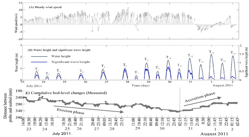 河口海岸、潮汐环境的沉积地貌过程是海岸海洋科学系的传统研究领域。近年来,海岸海洋科学系借助高精度、高时空分辨率的动力-沉积物-地貌观测系统和数值模拟技术,定量研究了河口海岸、潮汐环境中细颗粒物质输运的物理过程和机制,加深了对海岸带侵蚀淤积循环规律的认识。近期在长江口崇明东滩潮间带的研究发现,(1)侵蚀或淤积过程是由风速-风向和大-小潮周期的交互作用所控制的,即为近岸风和潮汐交互影响的结果(图1);(2)无论是在正常天气还是在风暴天气,近岸风均可以显著改变潮滩滩面高程;(3)上述过程可以通过经典的浪-流-沉积物耦合模型来描述和预测。这是对海岸冲淤规律的新认识,有助于进一步发展河口海岸演化的新模式,为建立潮滩和三角洲沉积地貌演化的正演模拟奠定基础,亦可并为海岸带综合管理和生物工程建设提供科学依据。该项成果以betway西汉姆联为第一单位发表于Nature Index期刊,论文的第一作者为betway西汉姆联史本伟博士:Shi, B. W., S. L. Yang, Y. P. Wang, G. C. Li, M. L. Li, P. Li, and C. Li, 2017. Role of wind in erosion-accretion cycles on an estuarine mudflat. Journal of Geophysical Research: Oceans, 121(1): 193–206, doi:10.1002/2016JC011902.。该项工作得到了国家自然科学基金面上项目的资助。