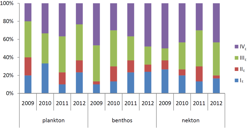 生态系统健康评价是生态系统保护和监测的重要内容。近岸海域生态系统与人类活动关联密切,近年来,越来越多的环境保护和监管部门以近岸海域生态系统稳定性和健康状态的持续保持为主要目标,该过程迫切需要综合性强、准确性高的评估系统来实现。生物多样性指标定量反映生物群落内物种多样性、丰富性和均匀性程度,是用来判断生物群落结构变化或生态系统稳定性的指标;生态能质指标不仅可以在时间尺度上度量生态系统的发展状况,还能从生态系统的结构及其所包含的微观信息上衡量系统的健康程度。为了定量评估研究区生态系统整体结构功能,课题组以江苏近岸海域水环境和沉积环境时空分布特征为背景,从近岸海域生态系统自身结构功能的角度出发,定量评价了江苏近岸海域生态系统健康状态的时空变化趋势。研究发现:(1)浮游植物群落以硅藻为主,江苏近岸海域南部(长江口北岸和养殖区附近海域)和北部(海州湾海域)为密集区;浮游动物群落以水母类、桡足类以及浮游幼体为主,渔场、河口较密集;底栖动物群落以多毛类、甲壳类和软体类为主,海州湾海域为底栖动物的密集区;游泳动物群落以鱼类为主,长江口北岸附近海域为密集区,各群落共同季节特征为夏季种类数多,密度大,2009-2012年群落结构等级赋值年际变化总趋势除浮游植物群落为增长外,其余群落都为下降;(2)不论是季节变化还是年际变化规律,江苏近岸海域生态系统生态能质等级以Ⅲ类和Ⅳ类系统居多,其中除浮游动物生态系统Ⅲ类占比最高外,浮游植物、大型底栖动物以及游泳动物生态系统生态能质等级第Ⅳ类占比最高;(3)生态系统健康态的整体性评估结果为:季节变化——秋季健康等级偏高,春季和冬季其次,夏季最低;年际变化——2006年整个江苏近岸海域生态系统健康等级偏高,2009年最低,具体为2006年>2012年>2009年,但生态系统健康等级年际变化总趋势为降低;空间变化——南部海域健康等级偏高,北部海域其次,中部海域最低。该研究建立适合近岸海域生态系统健康的整体评估体系,并突出了生态系统健康状态时空变化和系统自身结构功能健康状态及稳定程度的整体性评估方法,生态系统各子系统及指标量纲通过等级划分和赋分方式进入整体性评估体系,评估结果最终以多边形面积大小来反映,较为客观可靠。该方法的适用性强,只要系统的生态能质等级和群落结构等级可以被估算,该研究方法都适用,这对近岸海域生态系统管理和环境监测有重要指导意义。