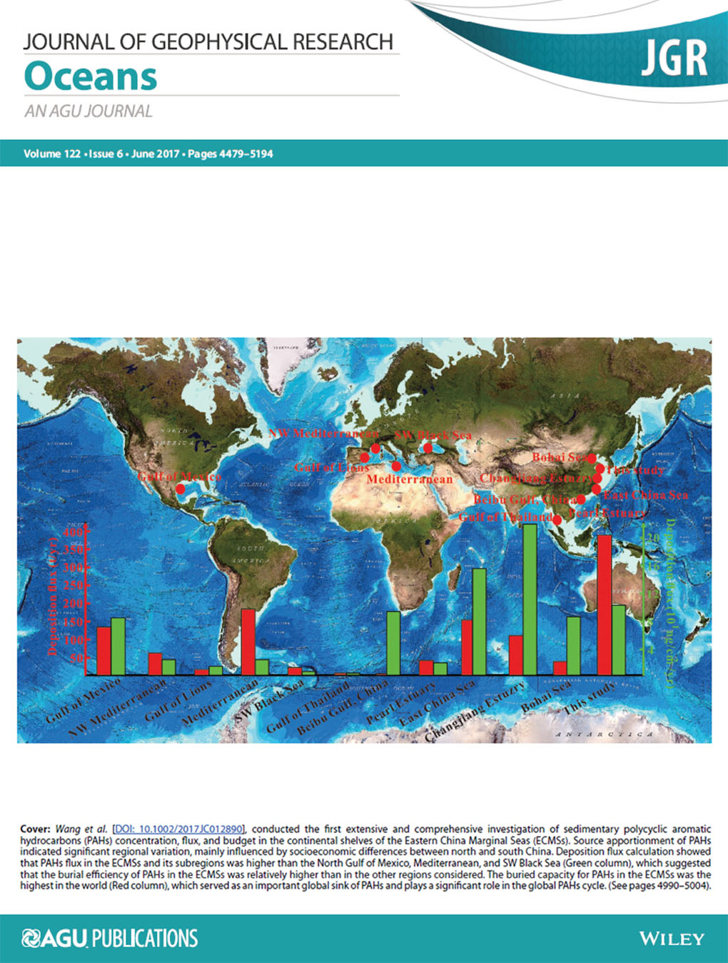 betway西汉姆联、海岸与海岛开发教育部重点实验室的邹欣庆教授课题组有关我国近海环境中多环芳烃(PAHs)环境行为方面的研究获得重要进展,相关成果以“Distribution pattern and mass budget of sedimentary polycyclic aromatic hydrocarbons in shelf areas of the Eastern China Marginal Seas”为题,以封面论文形式(图1)发表在著名地学综合性刊物《Journal of Geophysical Research: Oceans》上(J. Geophys. Res. Ocean. (2017).122, (6): 4990-5004.)。该论文的第一作者为betway西汉姆联2017级博士研究生王成龙,通讯作者为邹欣庆教授。