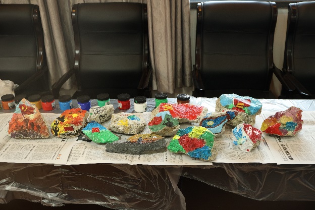 本次党日活动创新引入“戍边石”文化体验环节。在聆听了边防官兵以石为铭、坚守山河的感人事迹后,与会党员利用野外采集的各类岩石,将地理人的专业认知与对戍边精神的深切感悟相融合,亲手在粗粝石面上绘制祖国版图、描摹五星红旗,并镌刻下炽热的爱国誓言,创作出各具深意的“初心石”。