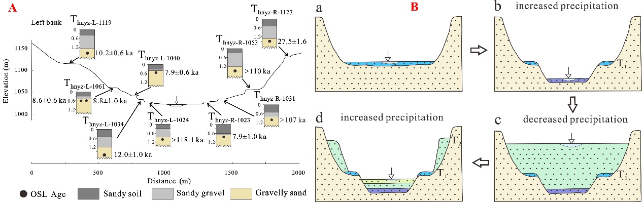 图2 西拉沐伦河部分阶地年代结果(A)与阶地发育新模式(B)