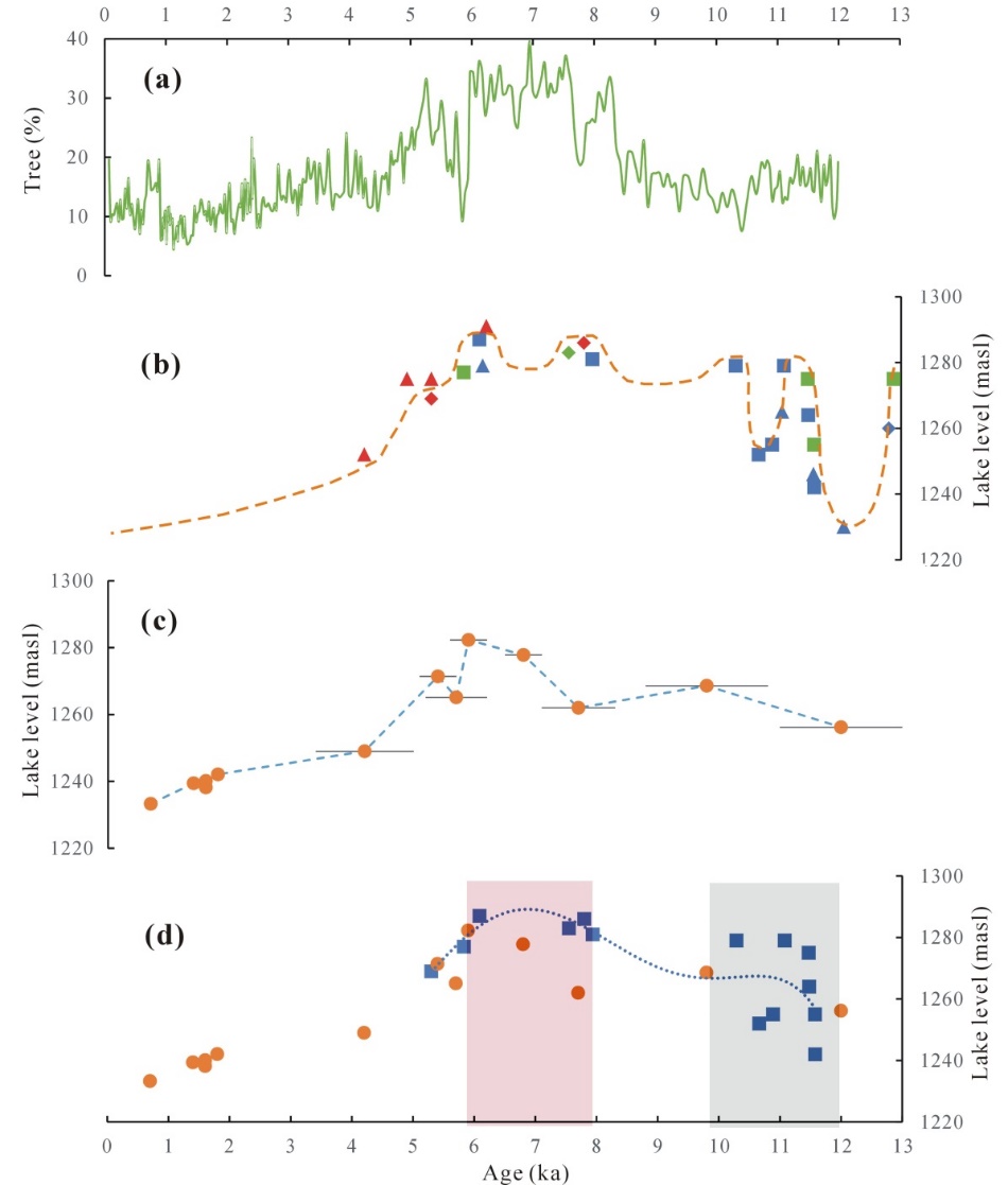 (a) 达里湖花粉记录(Wen et al., 2017);(b)湖泊水位记录(Goldsmith et al., 2017);(c)湖泊水位记录(本研究)。(d)本研究(圆形)和Goldsmith研究(正方形)的数据的对比。虚线是Goldsmith数据的多项式趋势线。浅红色条带代表中全新世高湖面时期,蓝灰色条带代表早全新世相对低湖面时期。
