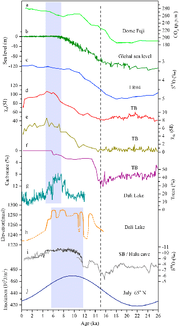 (a)Dome Fuji二氧化碳浓度(Kawamura et al., 2007);(b)海平面(Lambeck et al., 2014);(c)全球冰量(LR04)。(d-f)浑善达克沙地砂黄土剖面的磁化率、频率磁化率和碳酸盐含量;(g)达里湖树木花粉百分比(Wen et al., 2017);(h)达里湖的水位(Goldsmith et al., 2017);(i)石笋18O记录(Wang et al., 2001, 2008);(j)7月65N太阳辐射量(Berger & Loutre, 1991)。浅蓝色条带表示夏季风降水最大时段。