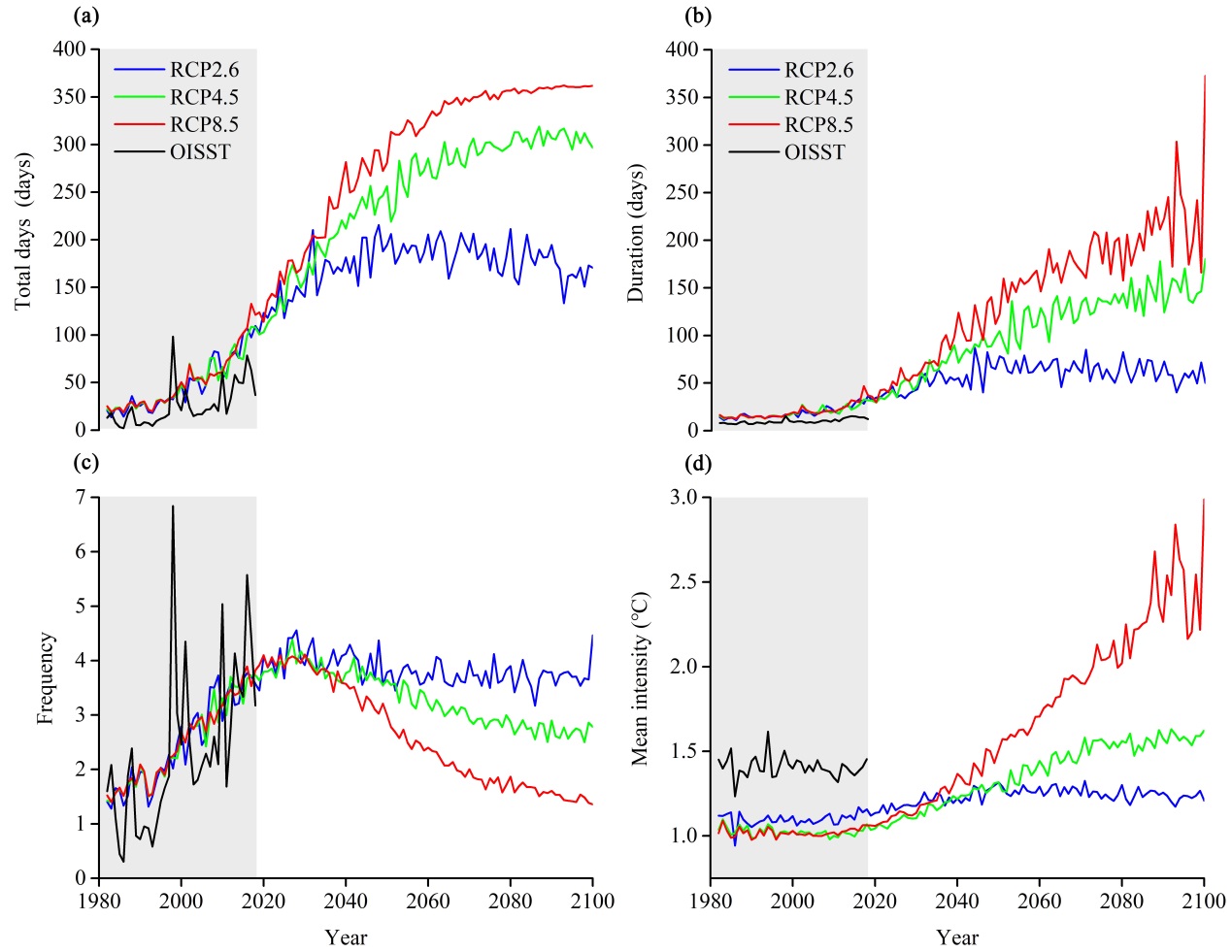 海洋是全球气候的重要控制器和调节器。海洋吸收了全球变暖增加能量的90%以上,并存储在700米以上海洋中。中国近海,尤其是东海海域,是海表增暖的热点区域,增温速率超过全球平均值。近年来,海洋热浪在全球海域内被不断报道,对海洋生态环境造成了严重影响,但对中国近海热浪研究相对缺乏。该研究基于高分辨率海表温度数据,结合CMIP5海洋模式数据对中国近海1982-2018年及未来海洋热浪变化情况进行了研究,并得出以下主要结论:(1)中国近海海洋热浪主要集中在渤海、南海北部湾、日本海和台湾岛以东洋面(图1)。(2)渤海内三大海湾海洋热浪严重,对当地渔业养殖、有害藻华爆发和海洋牧场建设带来潜在风险(图2)。(3)2040年是中国近海未来不同变暖情景下海洋热浪变化的关键节点(图3)。