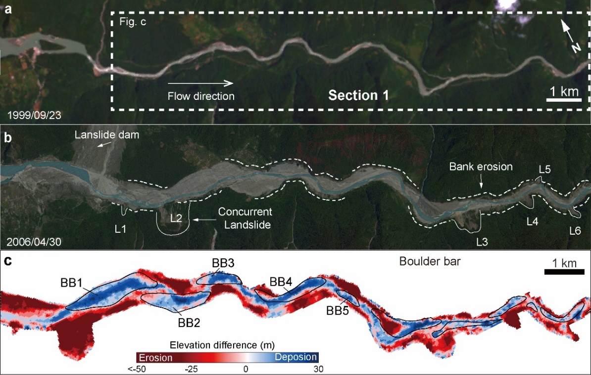 我们通过洪水发生前后的遥感影像(Landsat)、数字高程模型(SRTM和ALOS)、水力学模拟(二维HEC-RAS溃坝洪水模拟)以及野外考察(侵蚀和沉积的地貌特征、空间分布)等方法定量探讨这一次极端事件的地貌效应以及对区域河流地貌演化等的影响。结果显示,溃决洪水发生后,河谷拓宽了近3倍(图2),并且诱发了大量的次生滑坡(图2、3)。虽然这次溃决洪水的持续时间仅约10小时,但是其侵蚀输送能力相当于该地区河流长期连续作用约103年。同时,溃决洪水堆积数十个砾石坝(砾石粒径达到米级,图2),增加了河道的粗糙度,抑制了河流下切,对雅鲁藏布江大拐弯处河流裂点的稳定机制有一定的启示。总之,我们初步的研究揭示在这样构造活跃的山地地区,反复发生的极端溃决洪水对快速的剥蚀速率有较大贡献,可能是该地区控制地貌演化的主要地表过程。