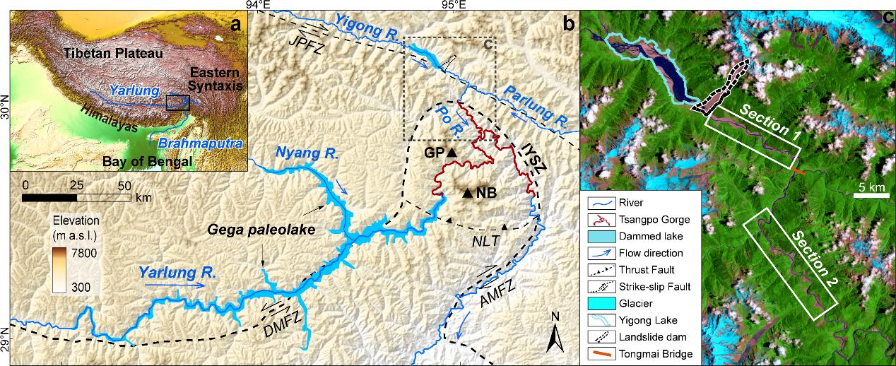青藏高原东南缘雅鲁藏布江大峡谷溃决洪水事件留下了深刻的地貌与沉积记录。其中易贡河作为雅鲁藏布江的二级支流,曾多次发生强烈地震活动,同时也是印度暖湿气流的北西输送通道(图1),容易诱发巨型泥石流、滑坡、堰塞湖形成及其溃决等极端事件。2000年6月10日的易贡湖溃决事件便是一例,其蓄水量为2×109 m3(相当于150个西湖的水量),洪峰流量达到12.4×104 m3/s,是目前有记录的世界第二大规模的滑坡溃决洪水事件(图1)。