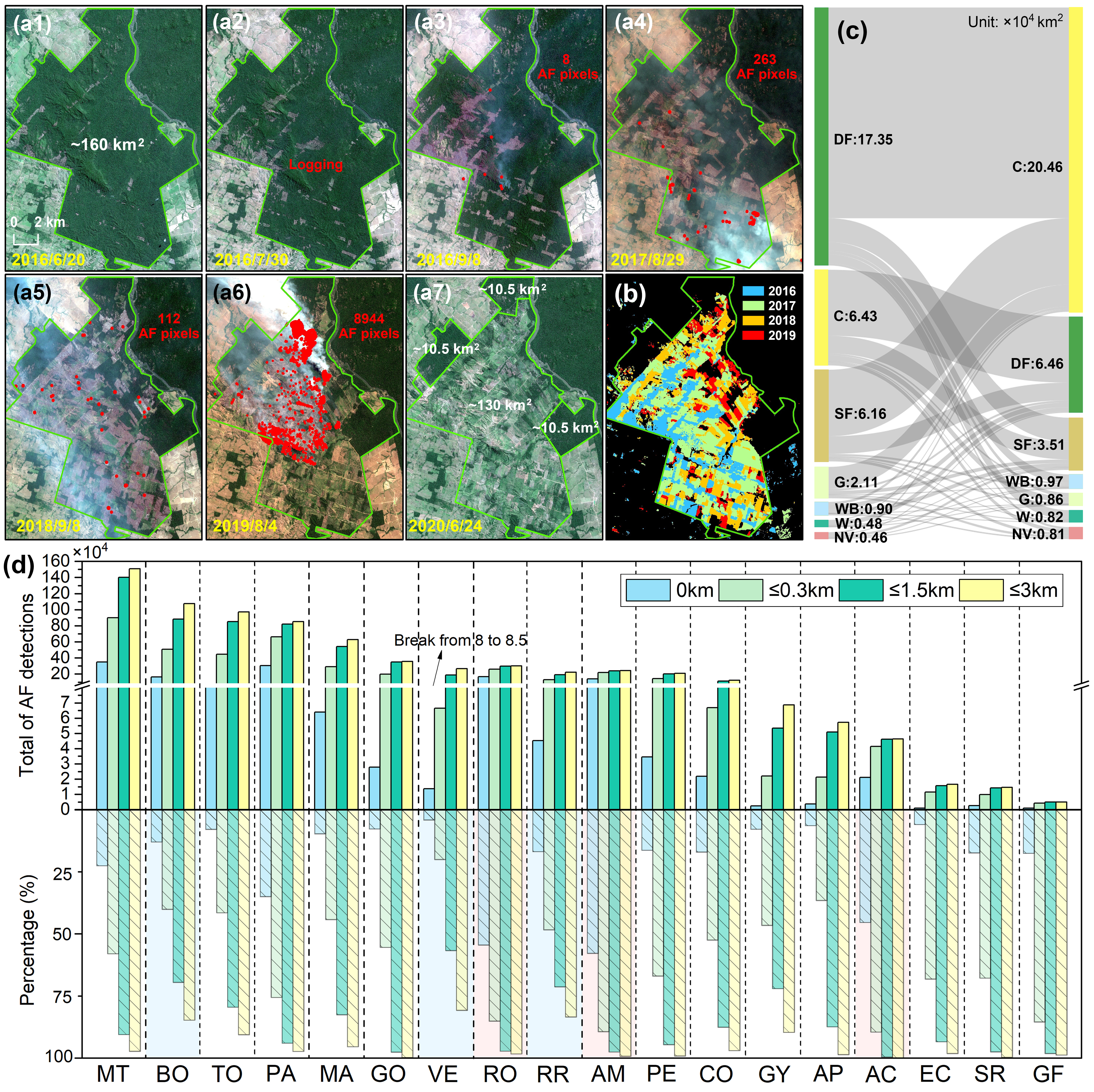 图3 亚马逊地区人为火发生机制。(a1–a7)时间序列MSI影像展示了巴西朗多尼亚州森林砍伐与火灾动态。(b)2016年以来该地区农用地扩张。(c)2008年至2018年亚马逊地区各土地类型的转移矩阵。DF:雨林;SF:灌木林;C:农用地;G:草地;WB:水体;W:湿地;NV:裸地。(d)新增农用地附近0.3 km、1.5 km和3 km范围内检测到的火像元总数。