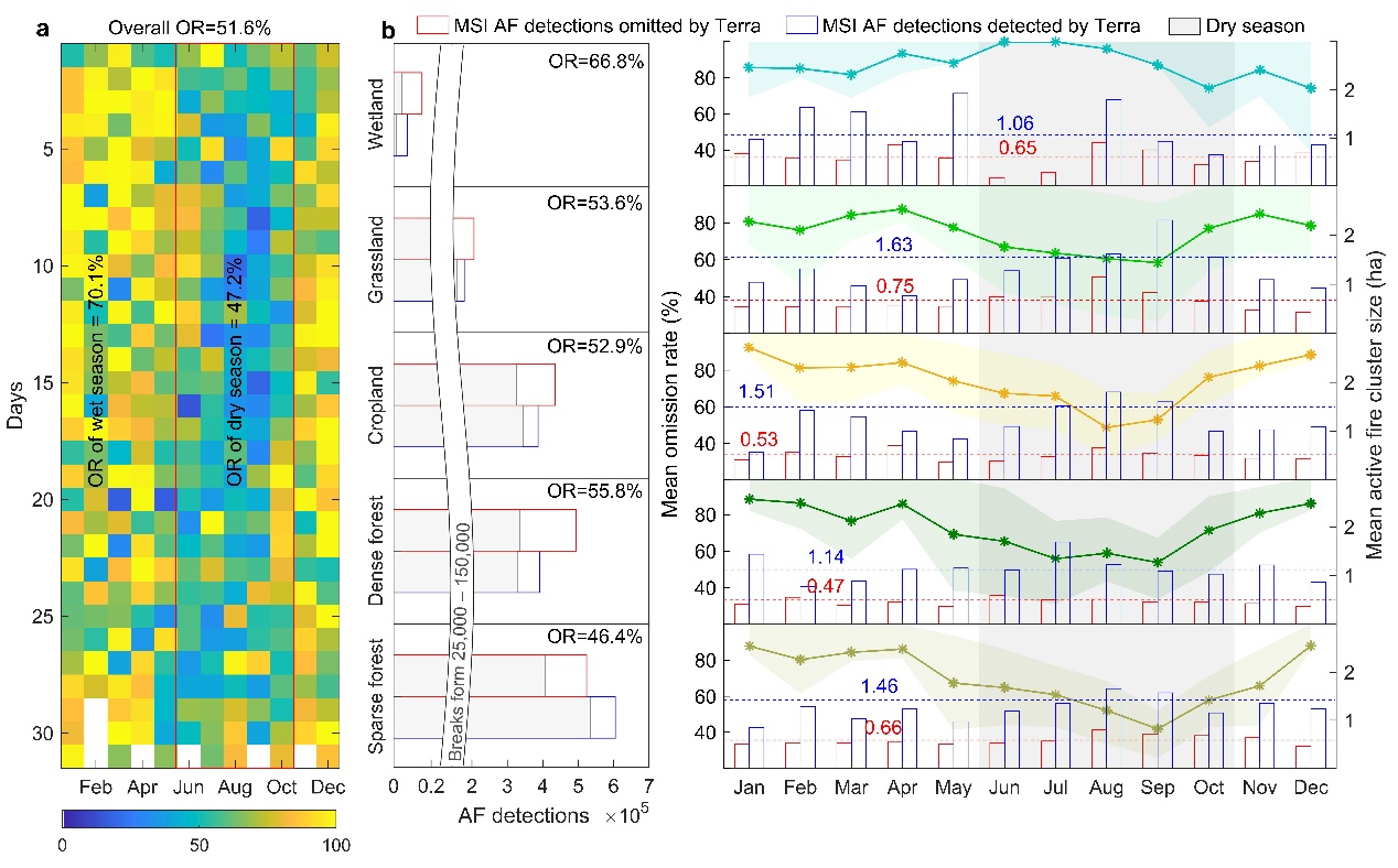 图4 MODIS火点产品在各月、各类土地覆盖类型中的遗漏率。(a)位于Sentinel-2成像轨道上的Terra MODIS火点观测的日遗漏率。(b)不同植被覆盖上的火点遗漏的比较。左面板显示了MODIS分别在湿季和旱季的检测率与遗漏率。右面板显示了MODIS的遗漏率和清单中被MODIS遗漏的火簇大小的月变化。