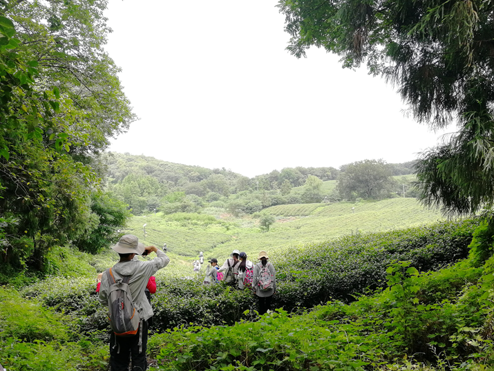 图2 六合方山古火山口及正在穿过茶园的同学们