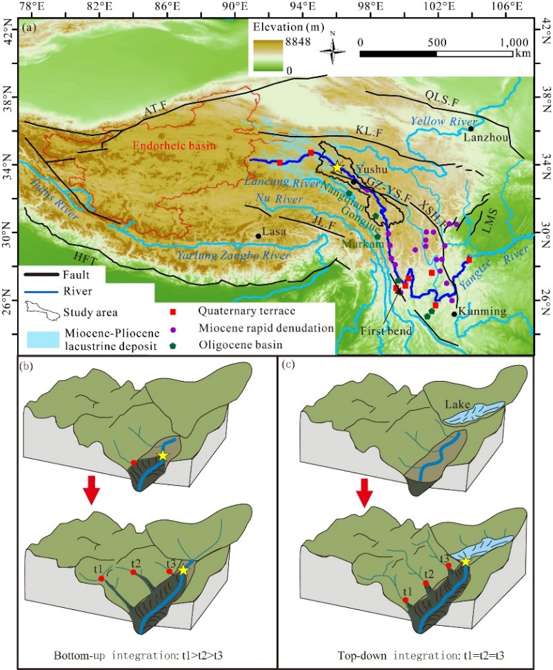图1 (a)青藏高原东南缘盆地年代、低温热年代数据和河流阶地年代数据; (b)自下游向上游溯源侵蚀贯通; (c)自上游向下游湖水溃决贯通。
