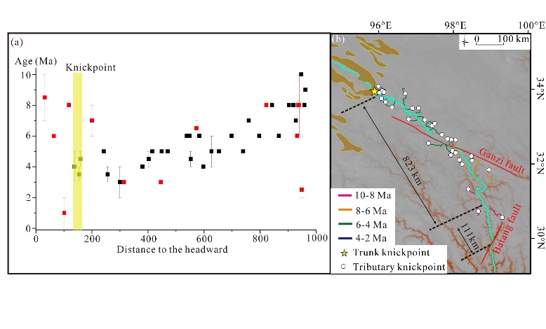图2 (a)长江上游支流裂点的空间分布和年代(a)和平面分布(b)。