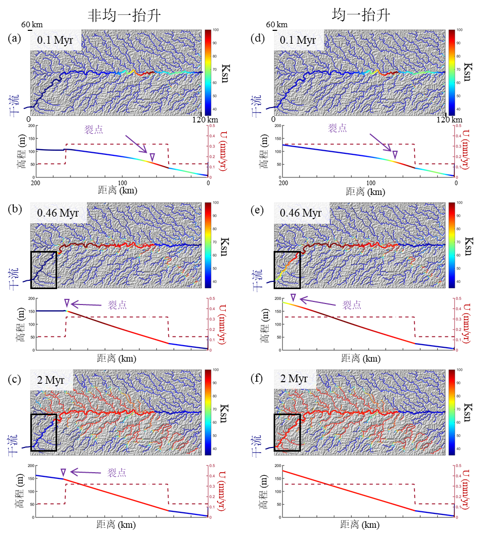 本研究通过黄河阶地、古地震探槽数据,并结合基岩河道侵蚀模型,约束了河流模型侵蚀模型中的关键参数(图2)(河流比降参数n和侵蚀系数K)。通过迭代计算,发现当n = 1.1、K = 2.25×10-6 m0.01 yr-1时,计算获得的区域侵蚀速率、裂点高程以及河道陡峭指数与观测结果最为接近,并由此推算提出,约0.46 Ma前,受天景山断层逆冲活动的影响,黄河河流裂点发育、并溯源迁移。然而,河流裂点代表的侵蚀波,仅在构造活动活跃的次级地块内部传递,裂点不会跨越构造块体边缘,对流域上游影响较小。进一步通过地貌演化数值模型模拟验证了上述结果。此外,对比模拟实验,揭示在空间均一性构造抬升背景下,裂点的溯源迁移则不会“停滞”、侵蚀波一直向流域上游传递(图3)。