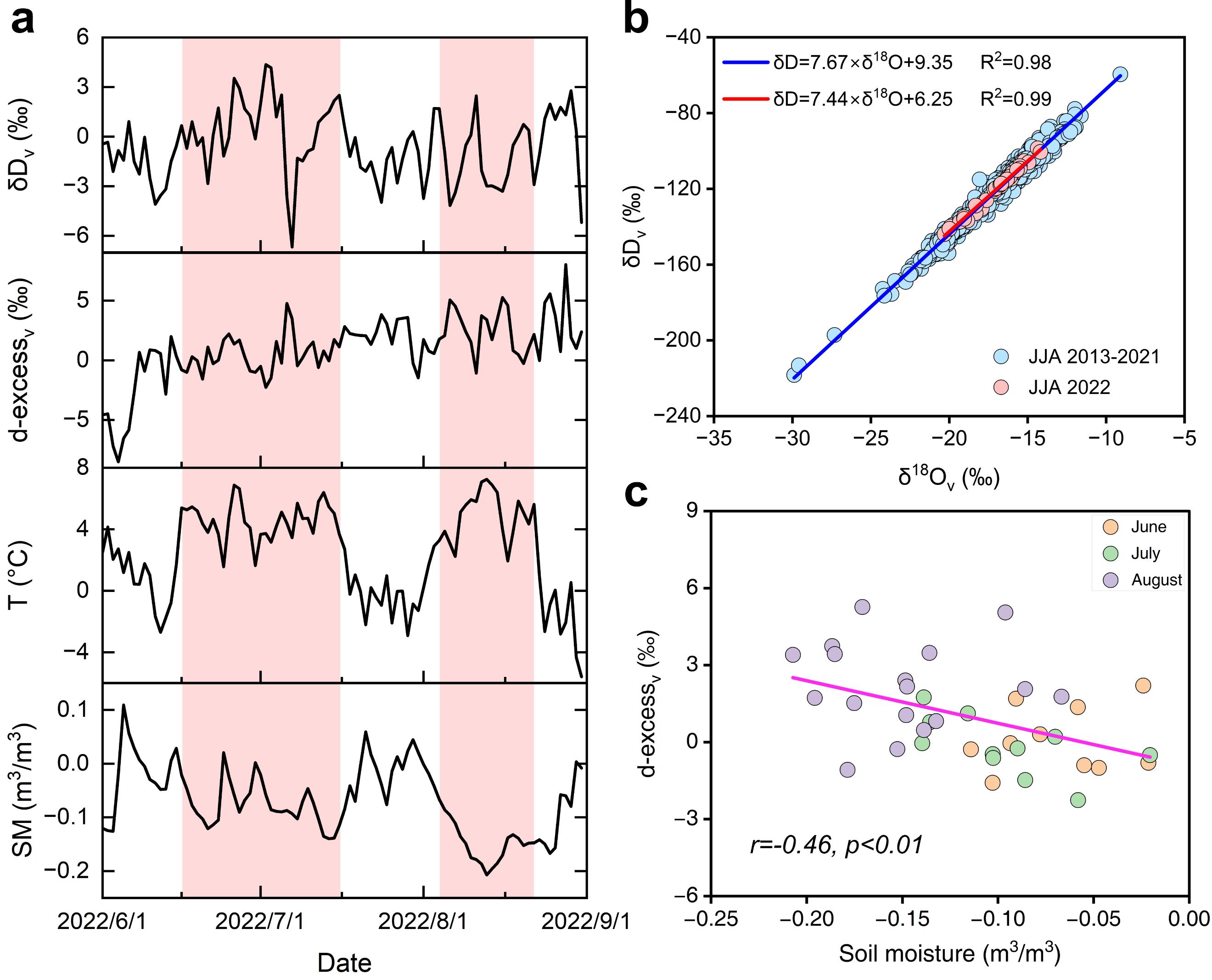 图2. (a) 南京2022年夏季水汽同位素、温度及土壤湿度异常。(b) 南京2022年夏季与2013-2021年夏季大气水线对比。(c) 南京2022年夏季土壤湿度与水汽d-excess值异常相关性。