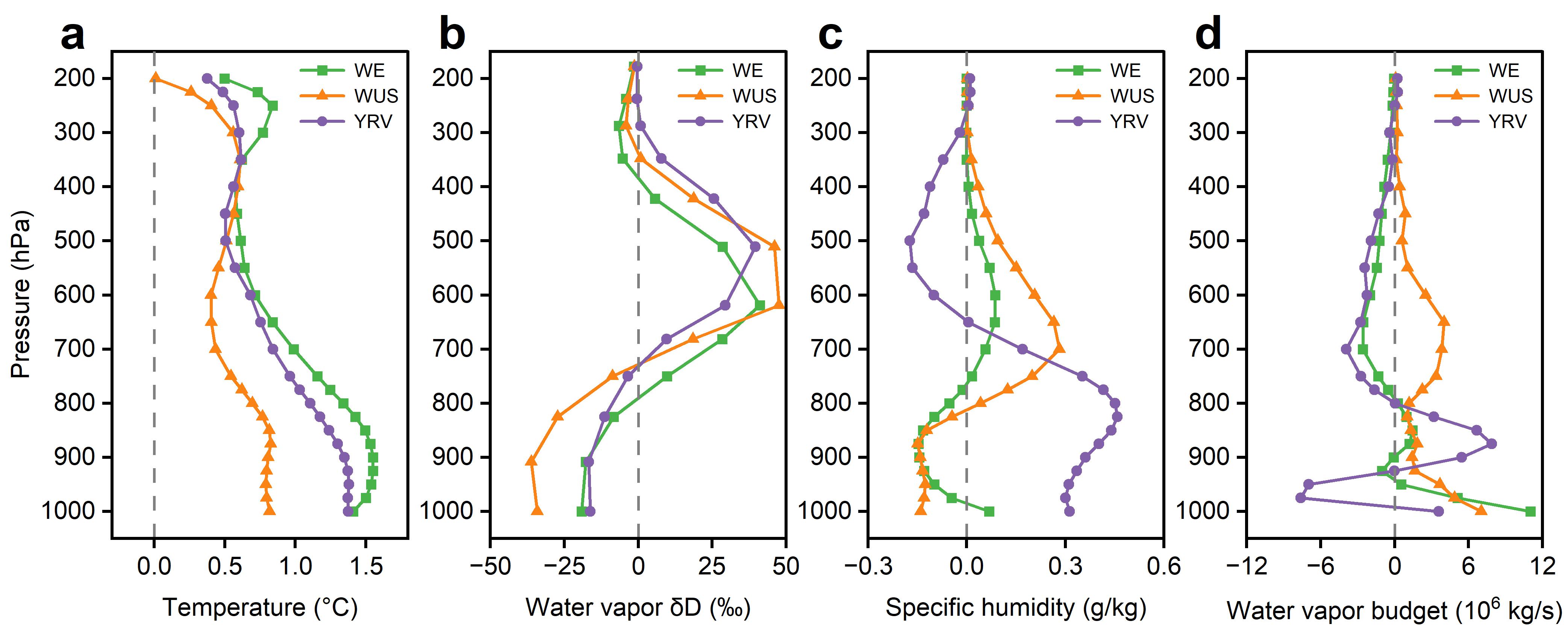 图3. 陆-气耦合关键区2022年夏季温度(a)、水汽同位素(b)、比湿(c)及水汽收支异常(d)的垂直分布。