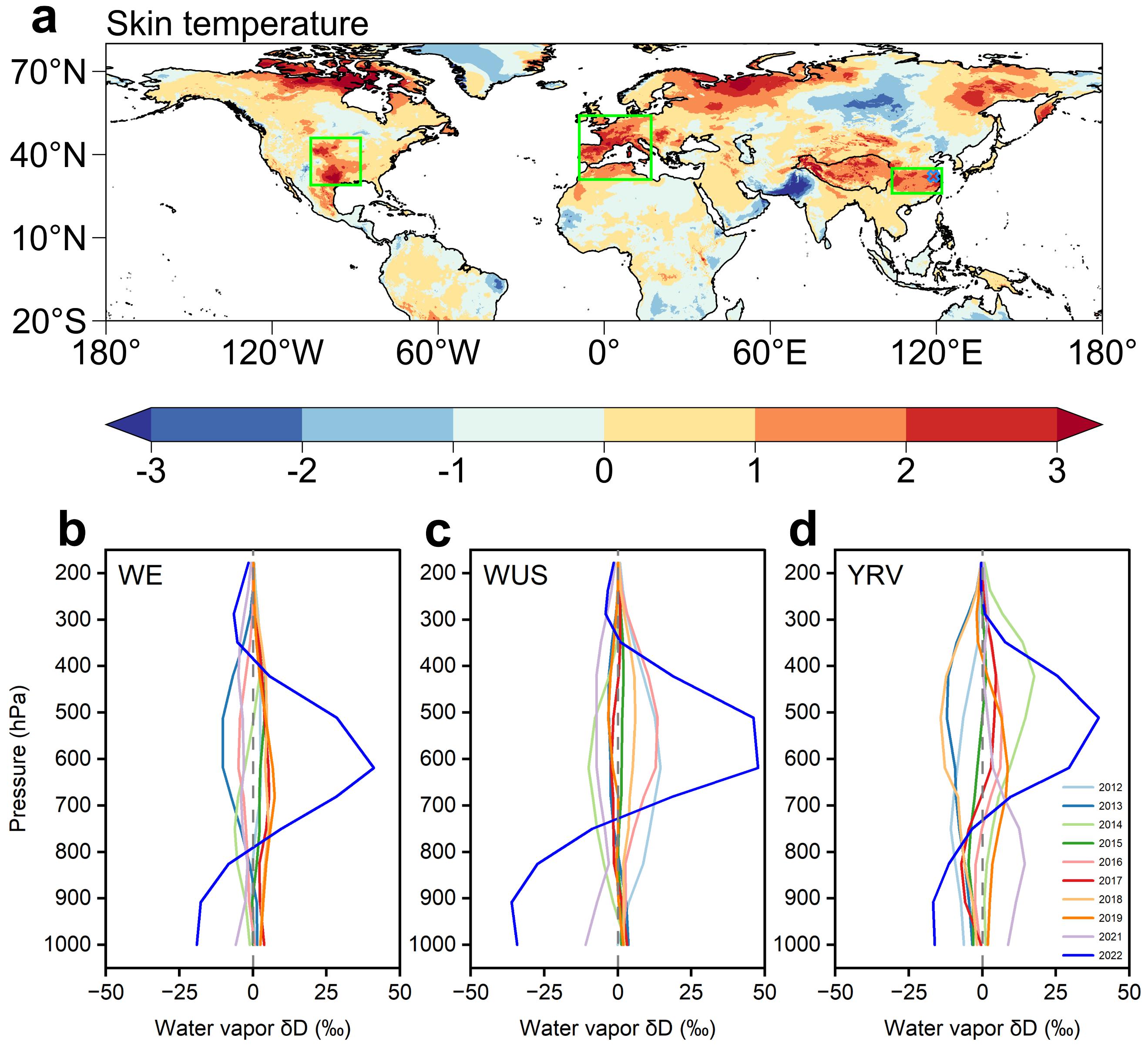 图1. (a) 2022年夏季地表温度异常。(b-d) 陆-气耦合关键区夏季水汽同位素异常的年际变化: