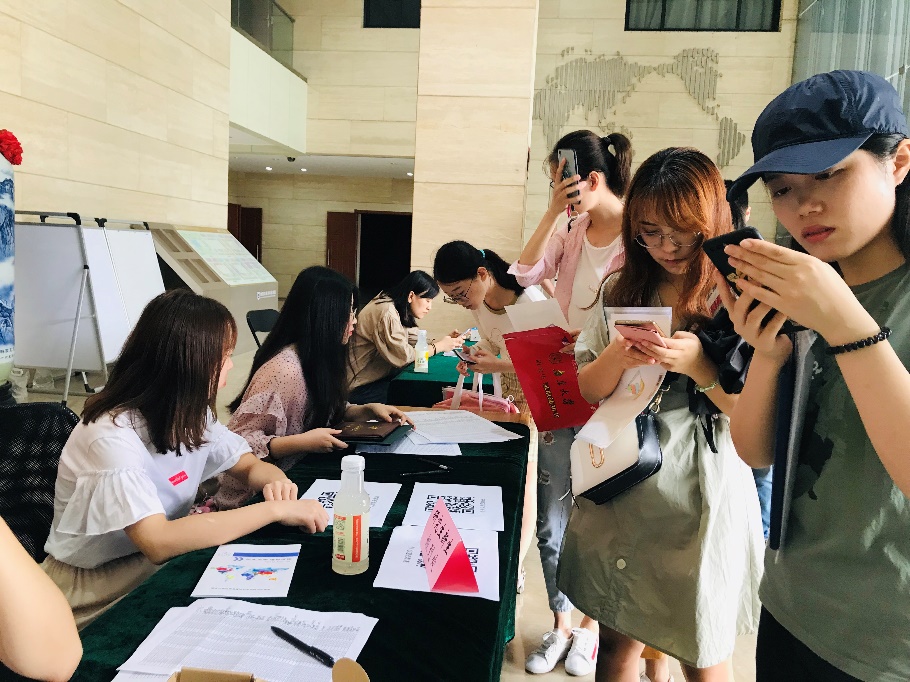 上午9:30,迎新工作开始,2019级研究生新生络绎不绝地来到现场,在研究生会迎新志愿者的引导协助下核对报道信息,办理入学登记并领取相关材料。昆山楼大厅中人头攒动、热闹非凡,志愿者的工作在繁忙中依然有条不紊地高效开展。同时,志愿者们的耐心答疑与热情互动,使得场面非常温馨和谐,既缓解了新生们初来乍到的紧张情绪,也代表公司全体师生传递了对新生的关爱与问候。
