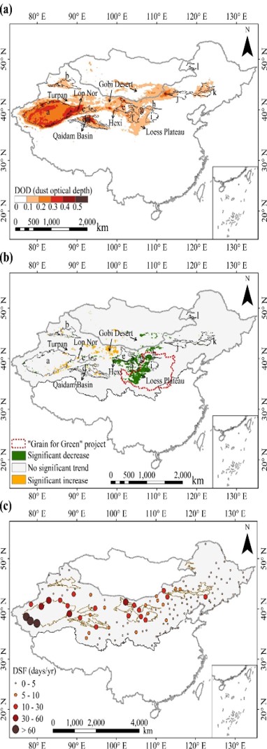 图1 (a) 2001-2020年中国和蒙古地区沙尘气溶胶光学厚度(DOD)空间分布特征。(b) 近20年DOD变化趋势。(c) 近20年中国北方138个气象站记录的沙尘活动频次。