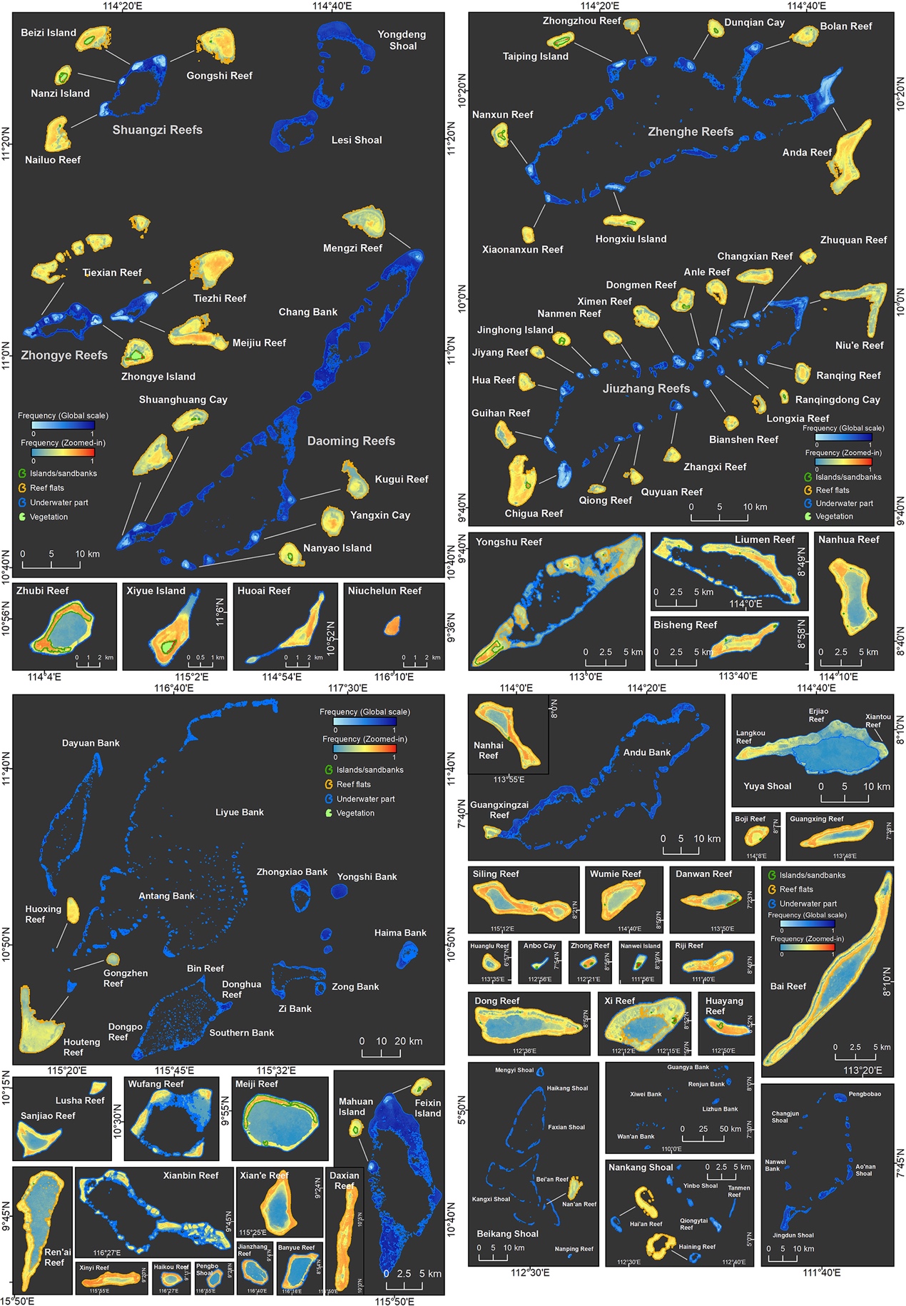 Dong,Y., Liu, Y.*, Hu, C., Xu, B. (2019). Coral reef geomorphology of the Spratly Islands: A simple method based on time-series of Landsat-8 multi-band inundation maps. ISPRS Journal of Photogrammetry and Remote Sensing. 157, 137–154. https://doi.org/10.1016/j.isprsjprs.2019.09.011.