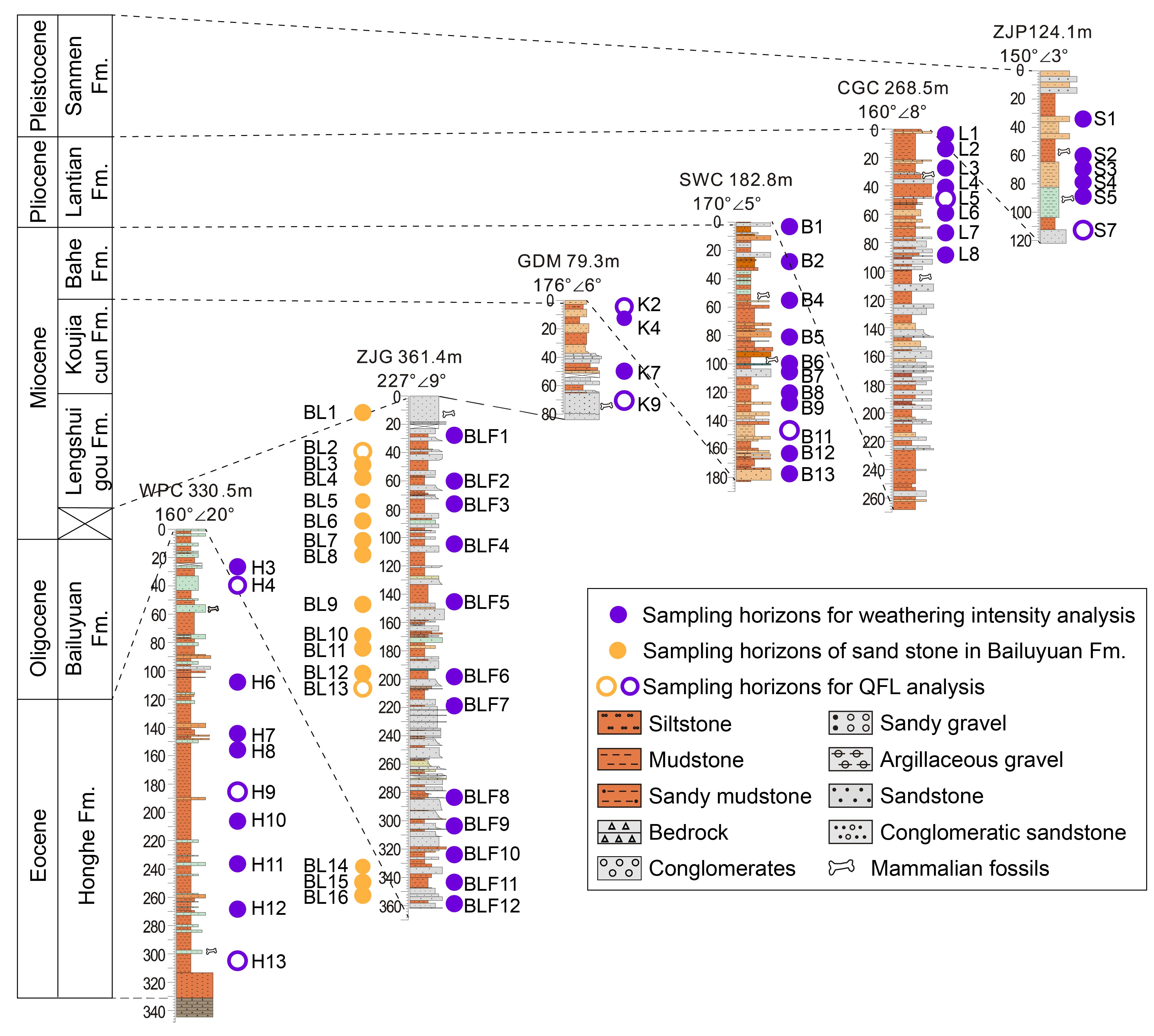 地表硅酸盐矿物分解消耗CO2,是重要的碳汇过程。理论上,硅酸盐风化增强可导致全球CO2浓度下降、气候变冷,反过来降低硅酸盐风化强度,这一负反馈过程可能是维持地球宜居性的重要机制。然而,新生代大陆硅酸盐风化强度演化规律及其主控因素仍存在较大争议,关键是长时间的连续的准确的证据匮乏。渭河盆地内保存了自始新世以来相对完整连续的新生代沉积物,盆地南部出露的近2000米的地层,涵盖了古近纪-新近纪-第四纪,是重建东亚大陆新生代硅酸盐风化强度演化的理想材料。