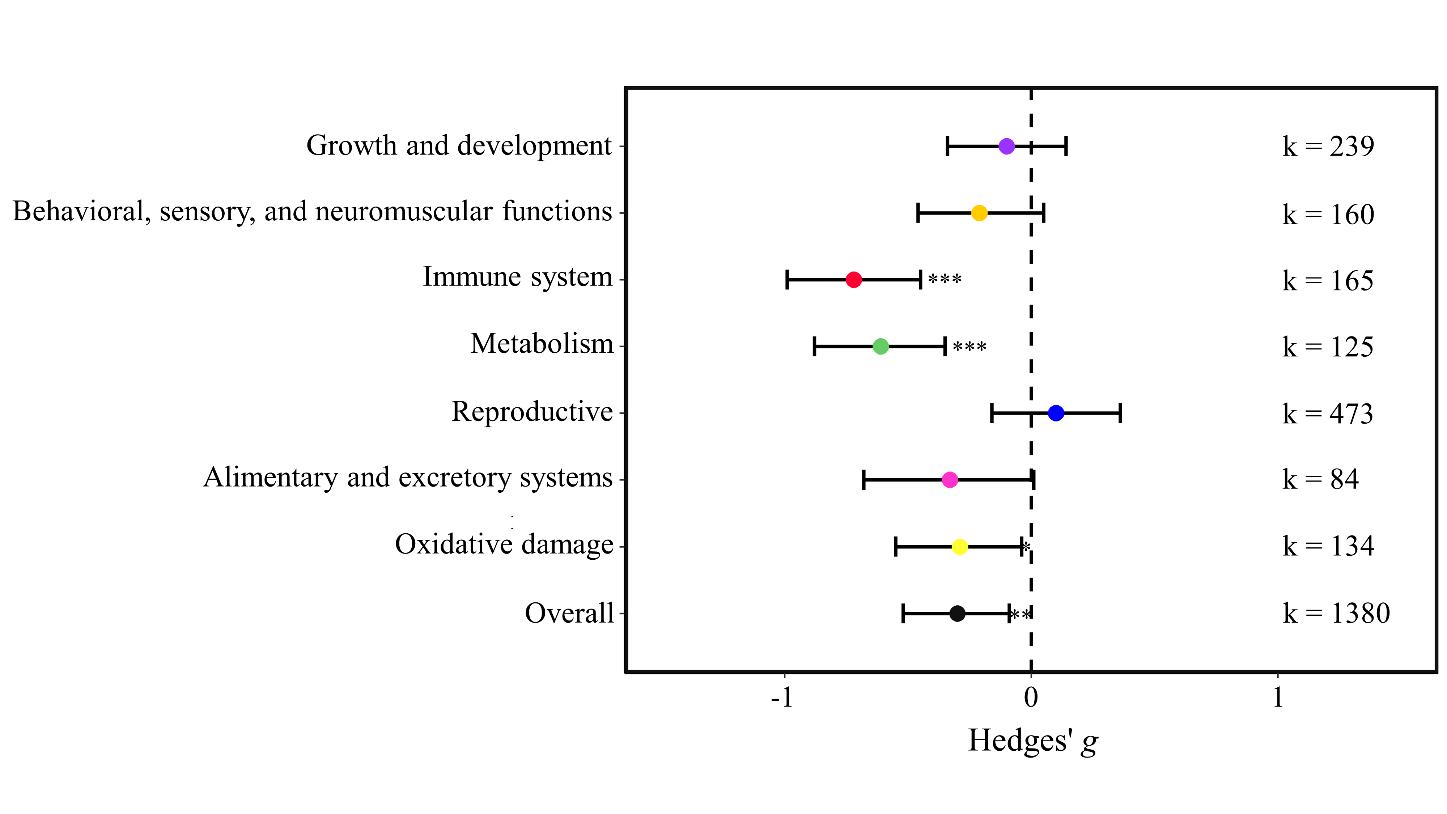 在此背景下,公司邹欣庆教授团队选择鱼类为目标研究对象,溶解态为污染物存在形式,进行了一项荟萃分析,定量总结全球文献中现有的实验证据,并使用效应大小估计器来确定毒性的变化(方向和大小)以及对生物功能和系统的影响。研究发现在环境MP浓度的背景下,共存污染物溶液中MP的存在显著增加了对鱼类的毒性,具体而言,MPs会增加对免疫系统、代谢和氧化损伤的负面影响,但对生长和发育、行为和感觉及神经肌肉功能、消化和排泄系统、繁殖没有显著影响(图2)。此外,通过亚组/元回归分析探讨可能影响毒性的因素,发现毒性的变化与鱼类的生长阶段和MP大小有关,但与共存污染物类型、MP类型、有机污染物的logKow、暴露时间无关(图3)。最后,从MPs、共存污染物、环境因素和实验对象四个方面讨论了实验室研究与实际水生环境的差异,这些差异可能会影响评估的准确性。本研究为从复合污染的角度进一步了解MPs对水生生物的潜在影响提供了基础。此外,鉴于污染是渔业资源减少的重要因素,本研究可以为水生生态系统的保护和管理提供参考。