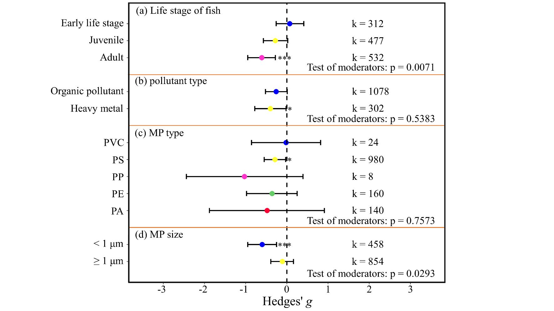 图3. 亚组分析:(a)鱼类生长阶段、(b)污染物类型、(c)MP类型、(d)MP大小