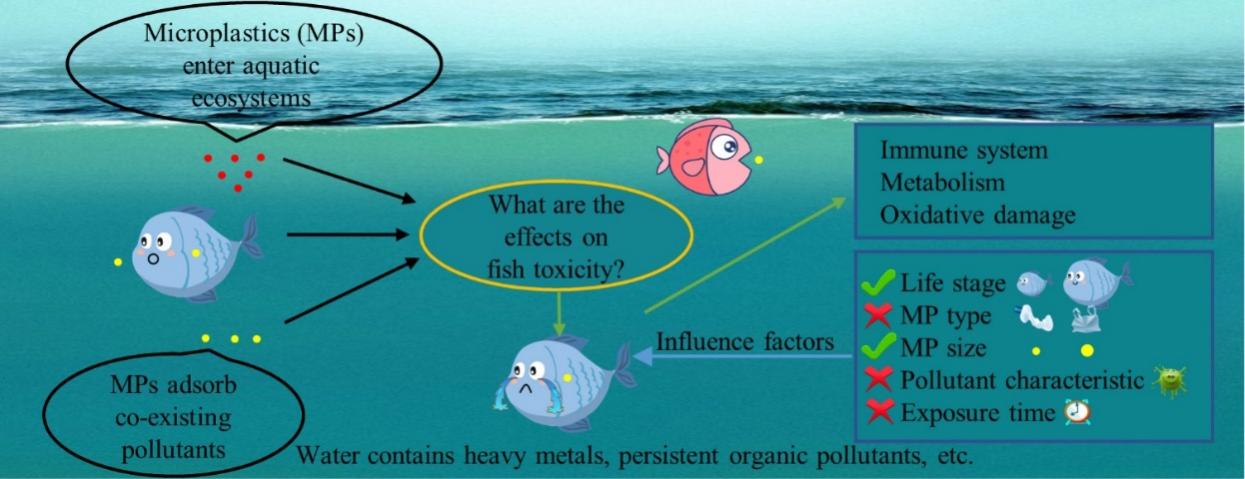 图1. 微塑料及共存污染物对鱼类影响的示意图