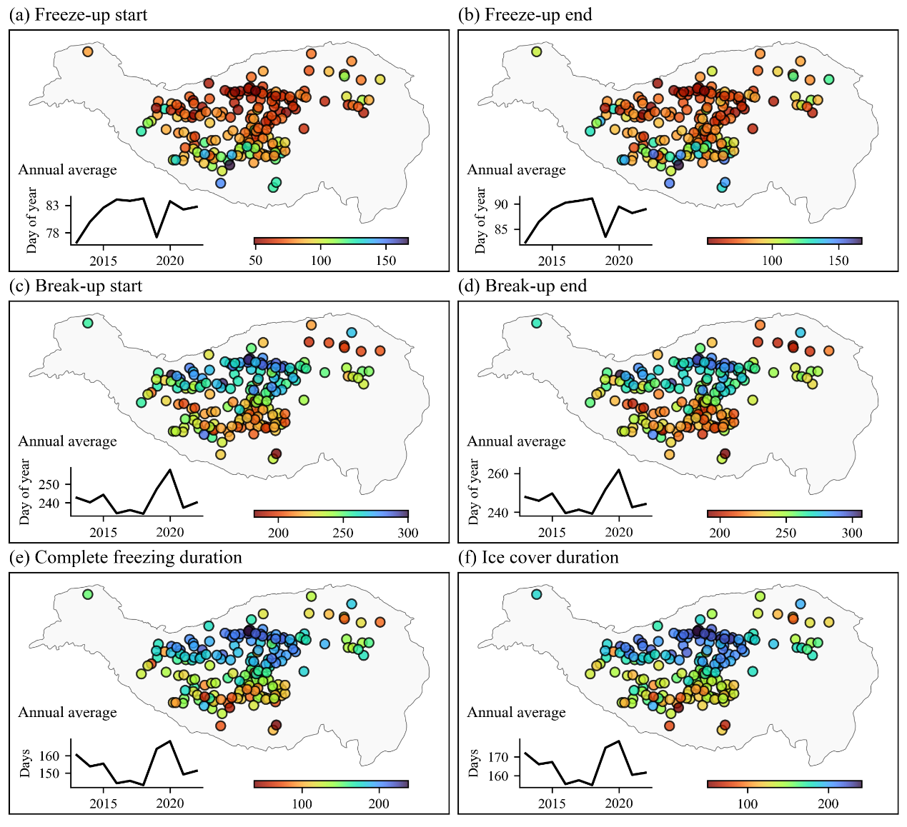 湖冰物候是指湖面冰层的形成与消融时间,是反映当地天气和区域气候变化的敏感指标,在湖泊的水文过程和生态系统中发挥着至关重要的作用。近几十年来,随着气候持续变暖变湿,青藏高原的湖泊及其冰物候特征发生了显著变化。尽管青藏高原地区拥有数千个季节性冰封湖泊,但由于环境极端、交通不便,关于湖泊结冰和消融时间的历史观测记录依然极为稀缺。同时,湖区周边气象台站分布稀疏,也进一步限制了现场观测数据的获取。