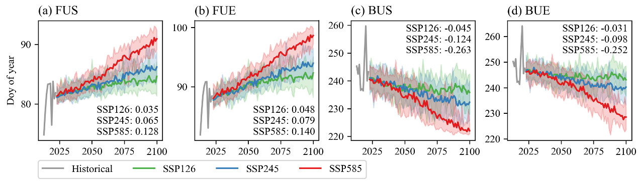 图2 2023-2100年不同SSP情景下青藏高原湖冰物候的未来变化趋势。