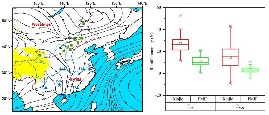 东亚夏季风是地球气候系统的重要组成部分,它给中国东部、日本、韩国等地带来了大量的降水,影响着世界十几亿人口的生产和生活。在过去的几十年里,东亚夏季风雨带南移,造成“南涝北旱”的格局,严重制约了农业社会经济的发展。但是,我们仍然不知道这种变化是人类排放温室气体引起,还是气候系统内部的自然变率。距今约一万年到五千年的全新世大暖期,在某种程度上可以类比21世纪的全球变暖。因此,为了预测未来东亚夏季风降水的变化,了解全新世东亚夏季风降水的时空变率显得至关重要。过去我们对东亚季风气候的认识主要基于石笋氧同位素记录。但是,由于中国东部地区氧同位素与降水的复杂关系,石笋氧同位素的解释还存在争议。此外,我们也不知道现代暖期相对全新世大暖期东亚夏季风降水增加或减少了多少。