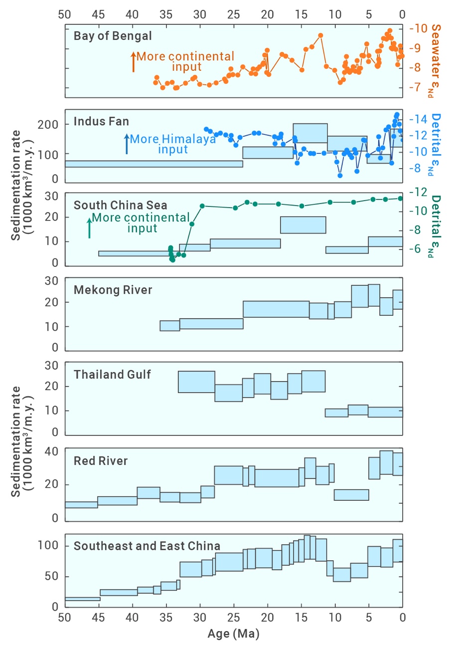 图3. 亚洲边缘海和太平样沉积记录揭示50 Ma以来亚洲大河和气候的演变
