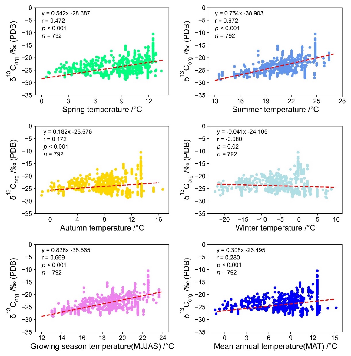 土壤有机碳同位素指标(δ13Corg)记录了古植被变化的历史,被广泛应用于古生态、古气候重建。以往δ13Corg作为代用指标被用于冰期降水量重建,而越来越多的证据显示,对于间冰期(如全新世)的中纬度地区而言,温度在影响C3/C4植物相对丰度方面起着关键性的控制作用,这为利用δ13Corg重建全新世温度变化提供了可能。