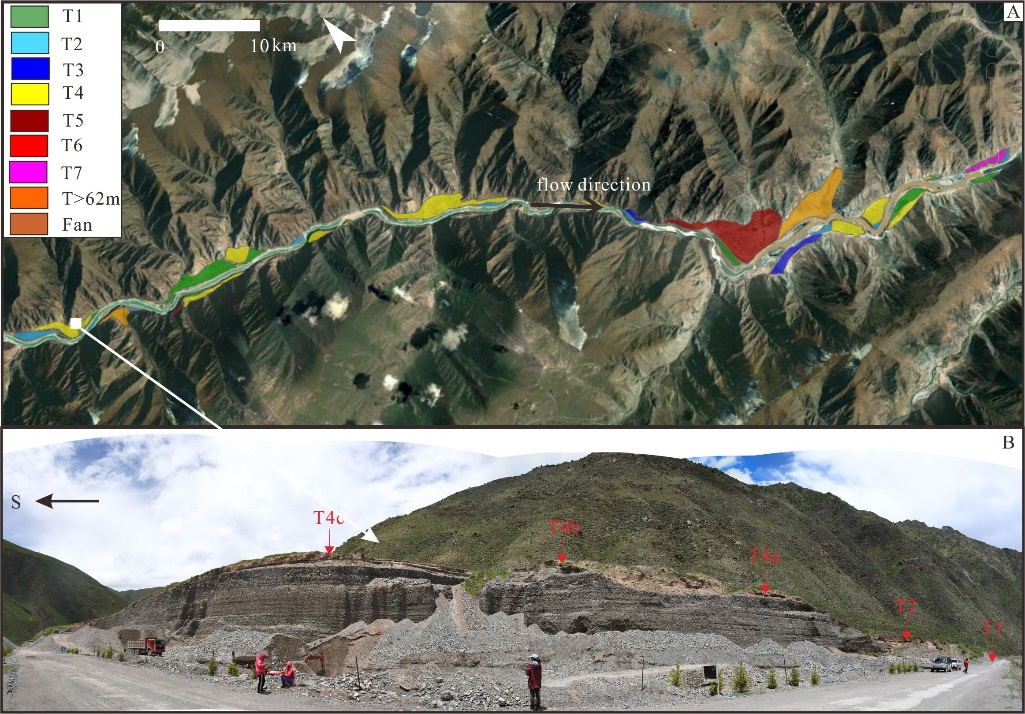 最近,公司教授王先彦和博士生于洋等在长江源通天河开展了河流地貌过程的研究,取得了重要进展,相关研究结果发表在国际知名学术刊物《GSA Bulletin》上。该课题组通过对通天河流域不同构造背景区河流阶地(图2)、沉积过程和光释光年代的详细对比研究,发现强烈的构造活动和极端的坡地过程等,导致峡谷区和盆地区河谷在末次盛冰期同时快速堆积和侧向拓展(侵蚀),形成超过60 m厚层堆积;在末次冰消期,季风逐渐增强时期,河流下切形成多级堆积阶地(图3)。