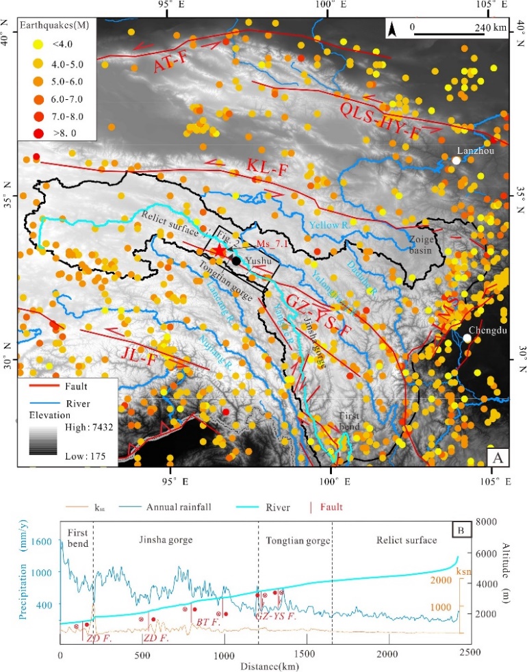 图1 (A)青藏高原三江源地区断层、地震和水系分布;(B)通天河河流纵剖面、陡峭度和降雨量分布