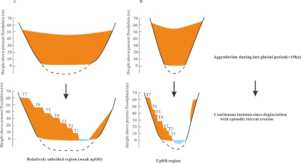 图3 长江源通天河流域构造相对沉陷区(A)相对抬升区(B)末次冰盛期以来河流沉积-侵蚀和河流阶地发育过程