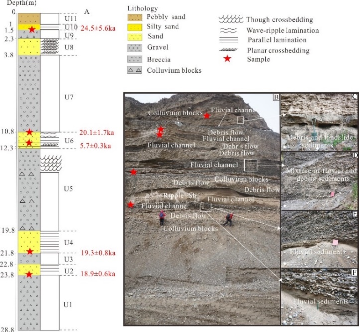 图4 河流沉积物、泥石流沉积物和崩积物交互沉积