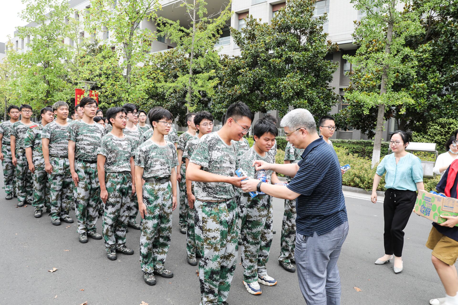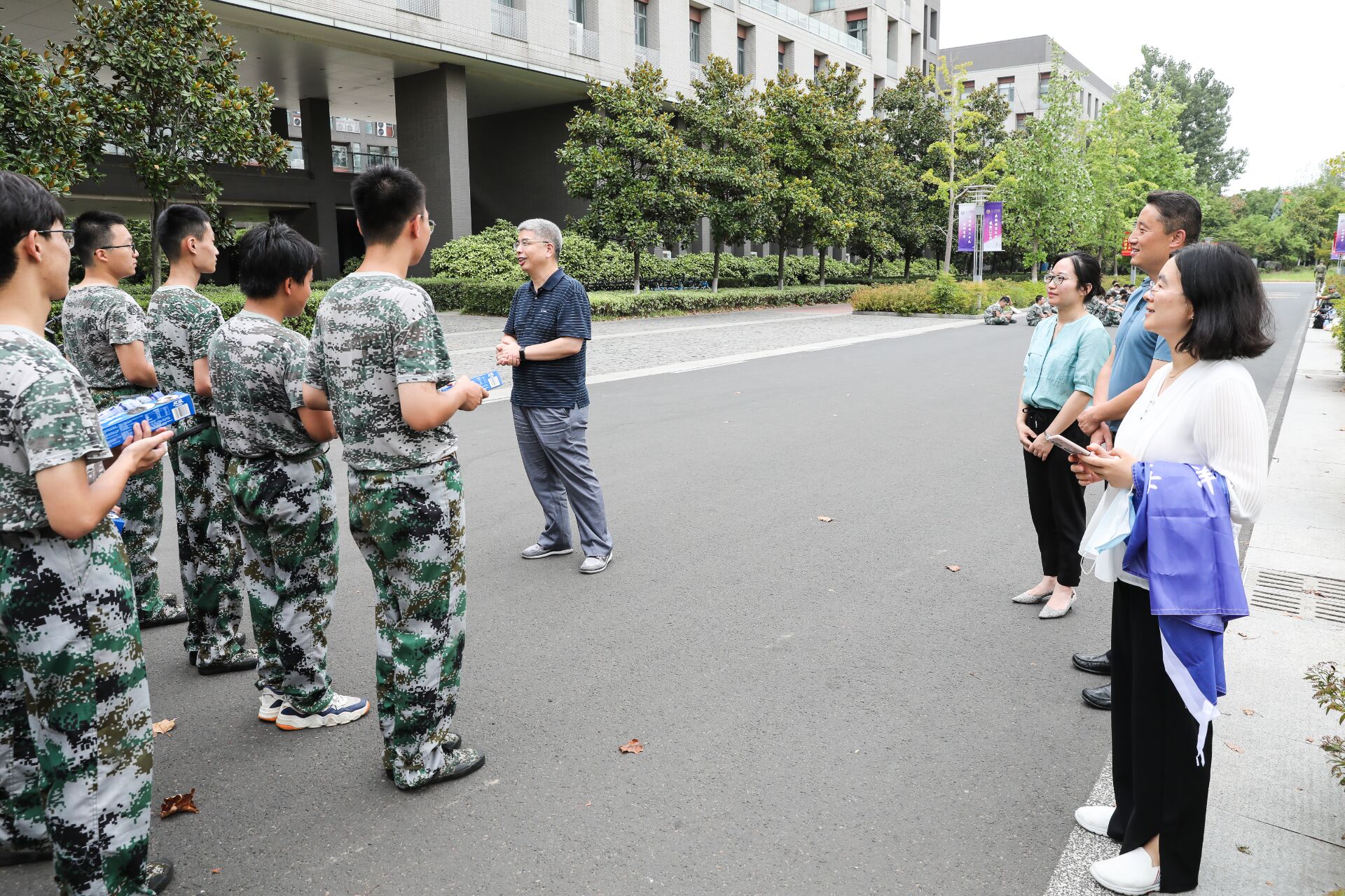 老师们首先对军训指导员与教官进行了交流,对他们军训以来的付出表达了诚挚的感谢。随后与员工亲切交流,了解同学们这些天的军训体验,倾听同学们的心声,并嘱咐同学们在军训的同时要注意防暑防蚊,时刻注意自身安全。李满春书记向同学们讲述了军训的重要意义,作为人生重要的一课,要从中有所思有所学。希望大家可以把军训养成的优良作风带到未来的学习与生活中,成为一个有责任、有担当的青年。最后,同学们领取了慰问礼包,并与老师们合照留念。