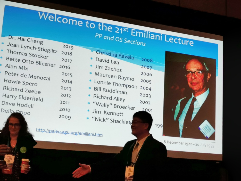 在上周结束的2019年美国地球物理联合会年会(AGU 2019 Fall Meeting)上,公司兼职教授程海应邀在大会上做了“Isotopes in Speleothems and Global Climate Change (石笋氧同位素与全球气候变化)”的主题讲座报告。这个讲座以著名地球科学家Cesare Emiliani的名字命名,旨在表彰在环境演变研究领域做出杰出贡献的优秀科研人员。自1999年设立以来每年仅有一人获此殊荣,程海教授是该讲座的第21位演讲者,也是首位华人演讲者。程海教授展示了他们通过高精度的石笋测年和氧同位素研究,揭示了亚洲季风和全球季风气候变化的规律的成果;他们提出的低纬度热量驱动全球气候长期变化的理论假说,可望对传统的天文气候理论提出挑战。程海教授的报告深入浅出、理论与证据紧密结合。一个小时的报告内容丰富,精彩纷呈,受到与会者的高度评价。