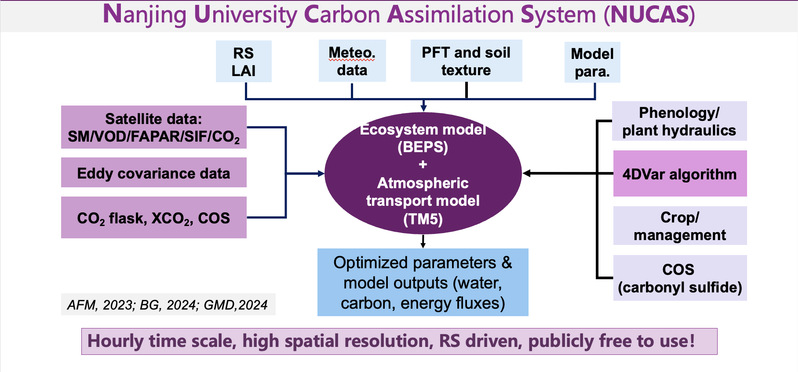 吴谋松,betway西汉姆联国际地球系统科学研究所,副教授,主要从事陆地生态系统碳循环模拟与数据同化研究,服务国家“双碳”战略及生态环境保护。代表性成果:(1)发展了生态系统模型碳循环关键过程及模型多过程参数敏感性分析与优化方法;(2)构建了具有自主知识产权的多源观测碳循环数据同化系统NUCAS(Nanjing University Carbon Assimilation System);(3)基于同化系统优化并生成了全球碳通量产品,揭示了全球及中国陆地生态系统碳通量对气候变化的响应机制。以第一/通讯作者发表SCI论文30篇,总被引1700余次,H指数20,获授权发明专利3项,软件著作权3件,担任气候变化领域权威报告IPCC AR6报告审稿人,以及碳循环领域国际最具影响力大会之一的ICOS2020主旨报告人。